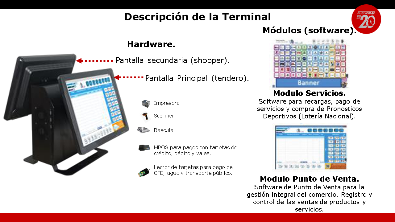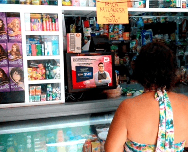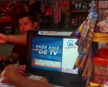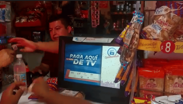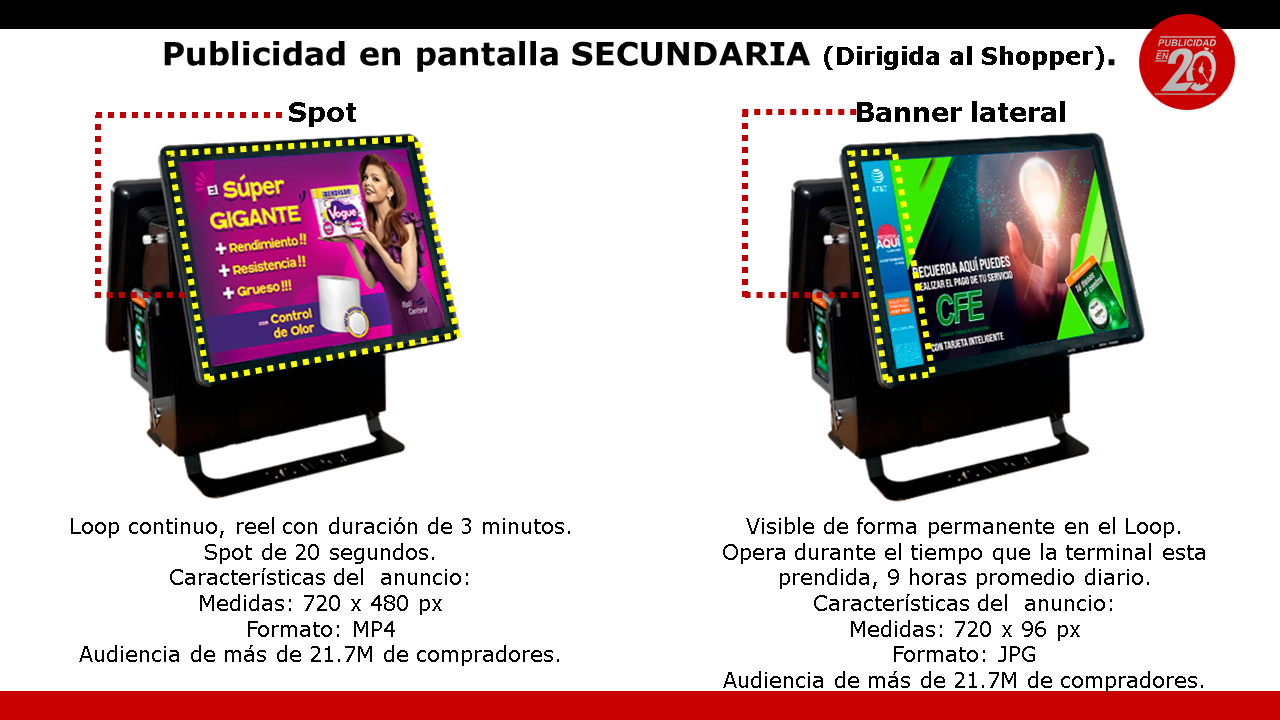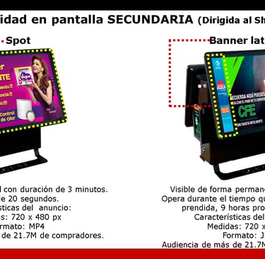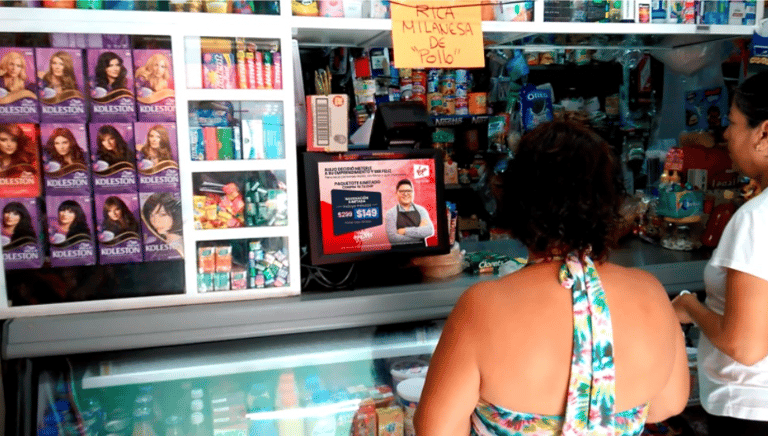 A través de la transmisión de videos publicitarios en la pantalla shopper de la terminal punto de venta de establecimientos como tiendas, papelerías y farmacias.